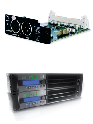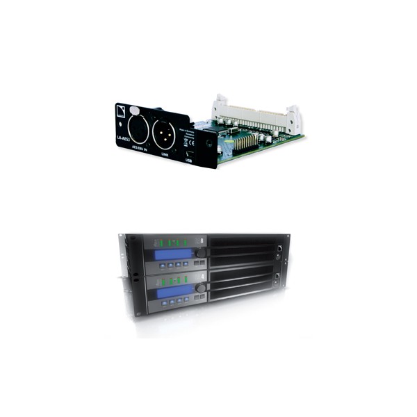 La carte LA-AES3 dispose d’une entrée stéréo AES/EBU et d’un port AES/EBU de reprise afin de connecter les LA4 et les LA8 à toute console de mixage numérique ou à tout système de distribution audionumérique en réseau, en maintenant intégralement le signal dans le domaine numérique.